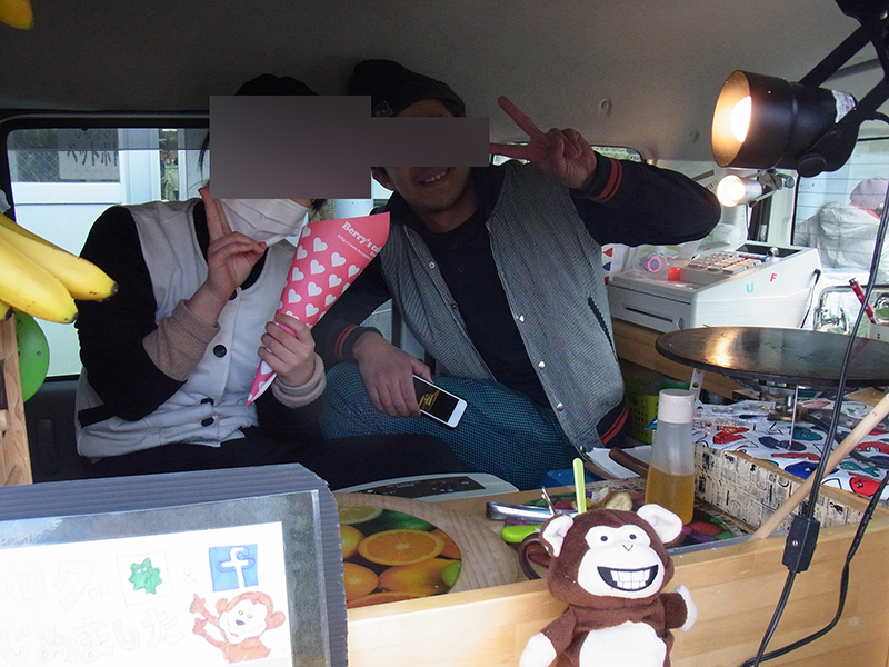 丸い台がクレープ焼き器ですね。電源はお店から借りています。クレープの販売は若い方や学生の多いところのほうが売れるのではないでしょうか?